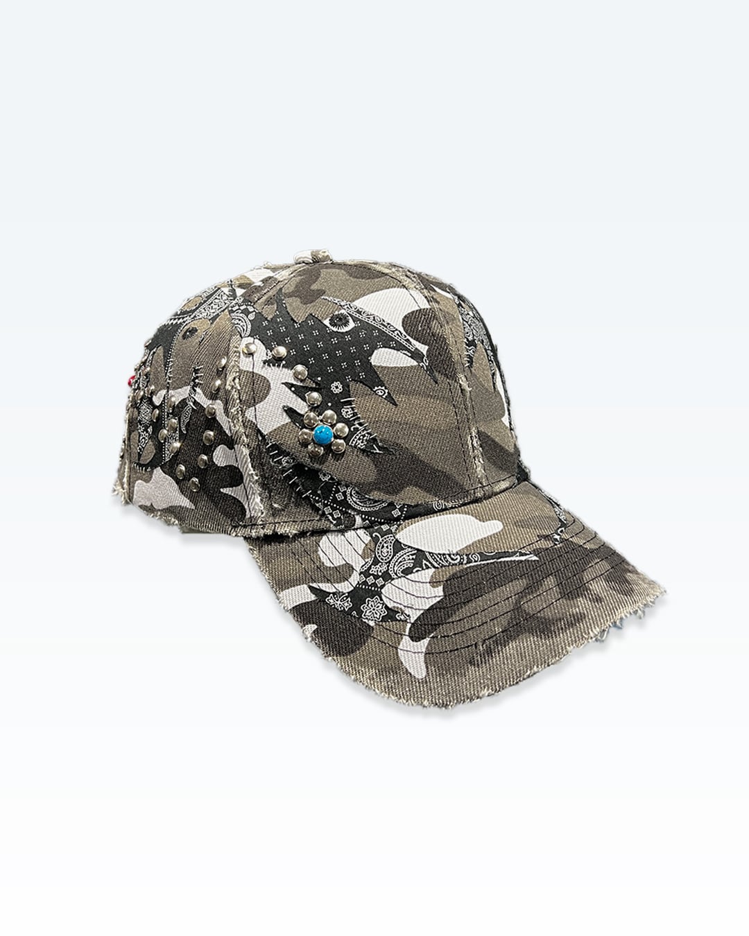 Thank u for coming our page‼︎! PN:25-146 異なる時代と文化の断片を再構築した、TRIPLE DEMICのシグネチャーキャップ。 カモフラージュをベースに、ペイズリー由来のトライバルパターンとカシメによるラインワークを重ね、 無骨さと静かな緊張感を併せ持つ佇まいに仕上げた一点。 ※ハンドメイドという性質上、記載以外の把握しきれない 軽微なダメージ汚れがある可能性も予めご了承下さい SIZE:FREE ■キーワード ・オーバーサイズ ・ビッグサイズ ・古着 ・90年代 ・80年代 ・ 90s ・ 80s ・ヴィンテージ ・ビンテージ ・vintage ・ USA ・アメカジ