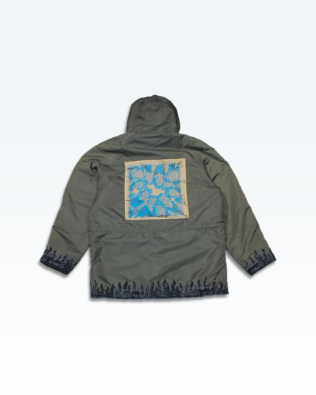 裾と袖にペイズリー調ファイヤーパターンを縫製。