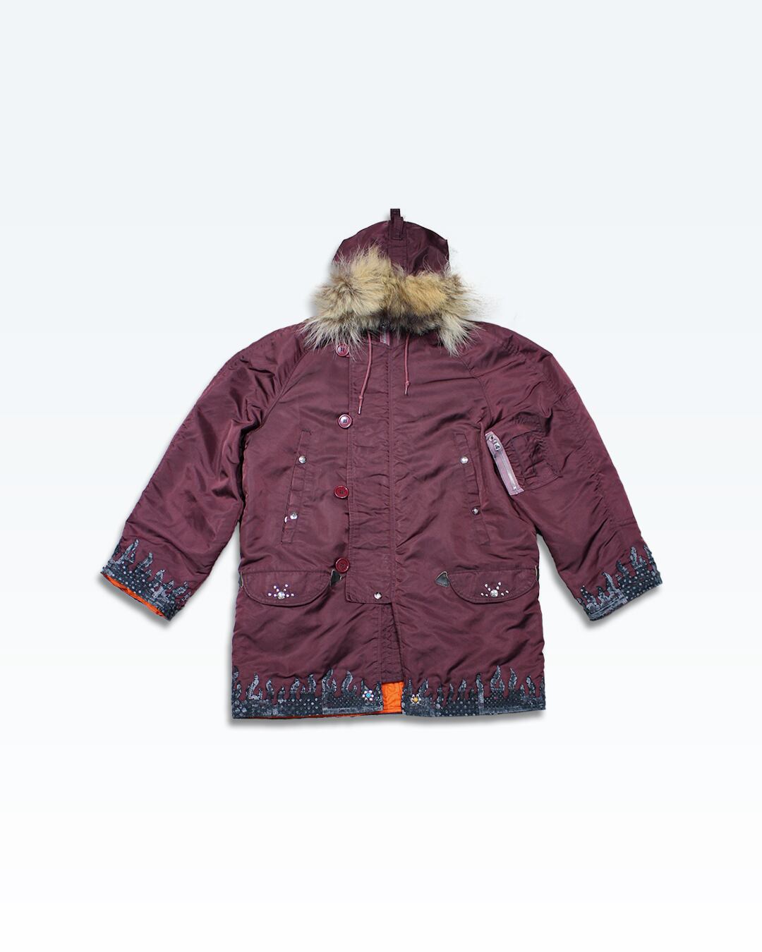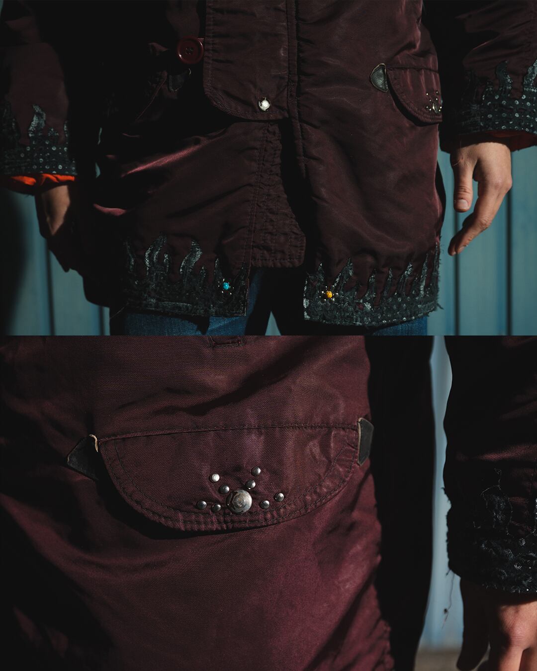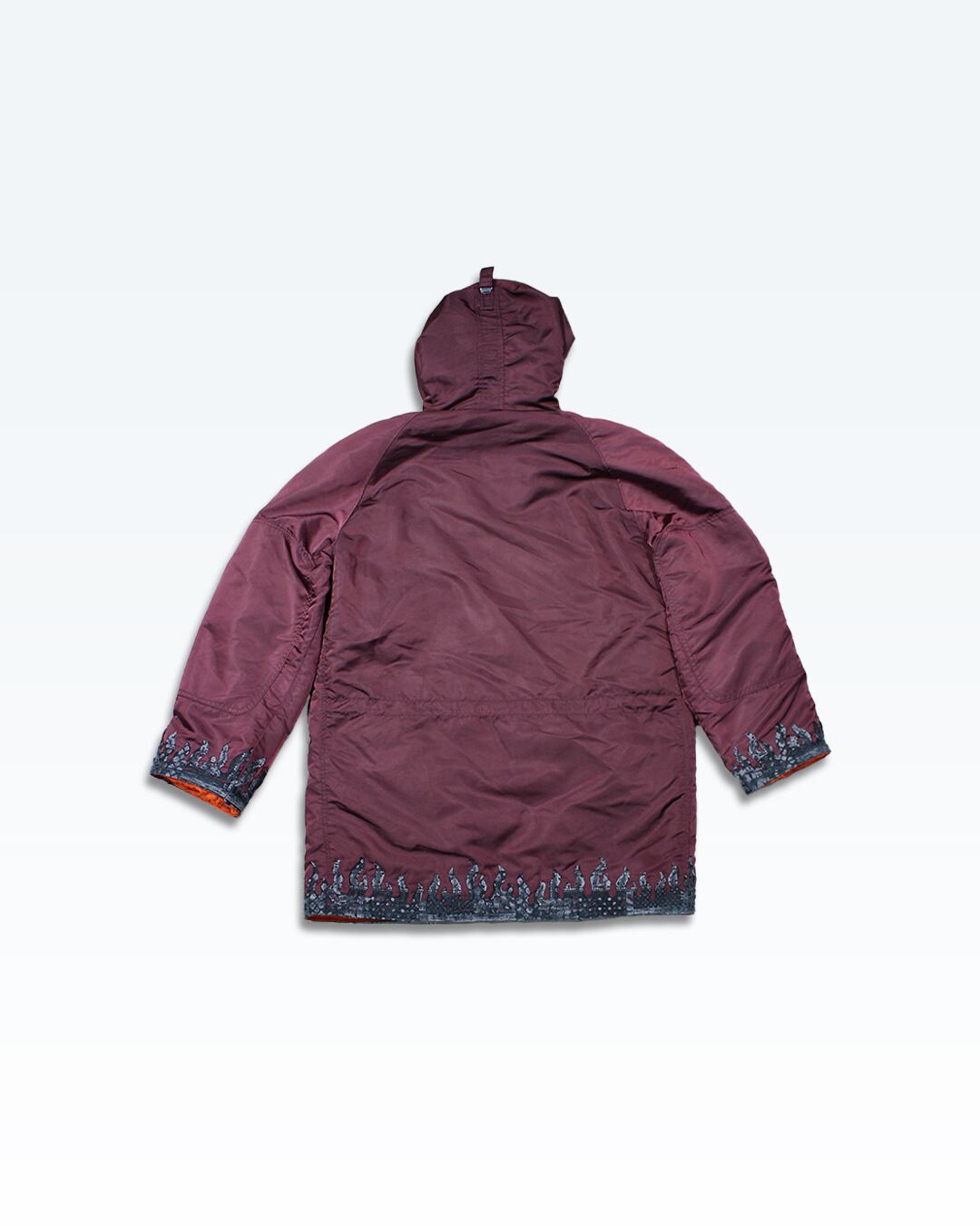 裾と袖にペイズリー調ファイヤーパターンを縫製。