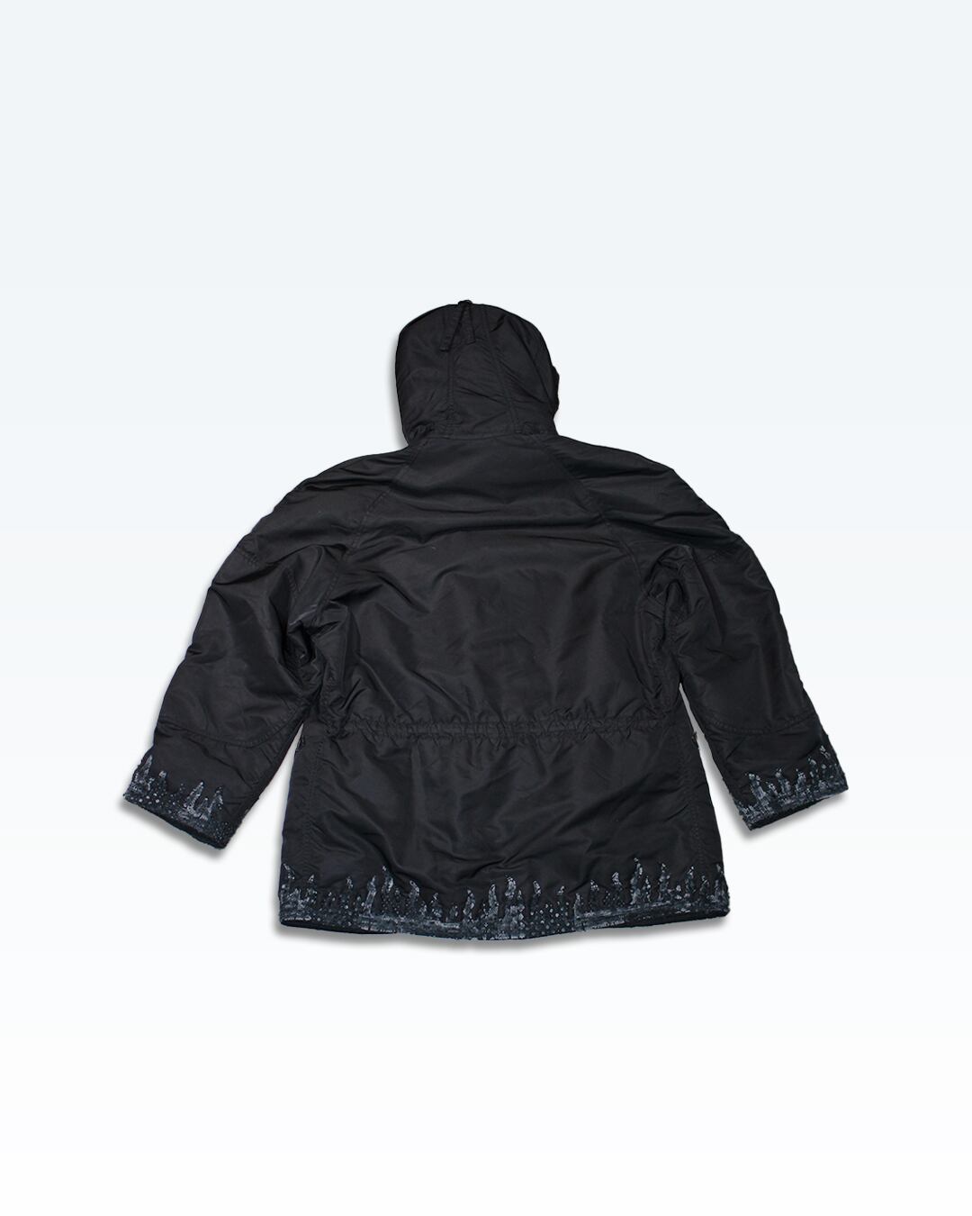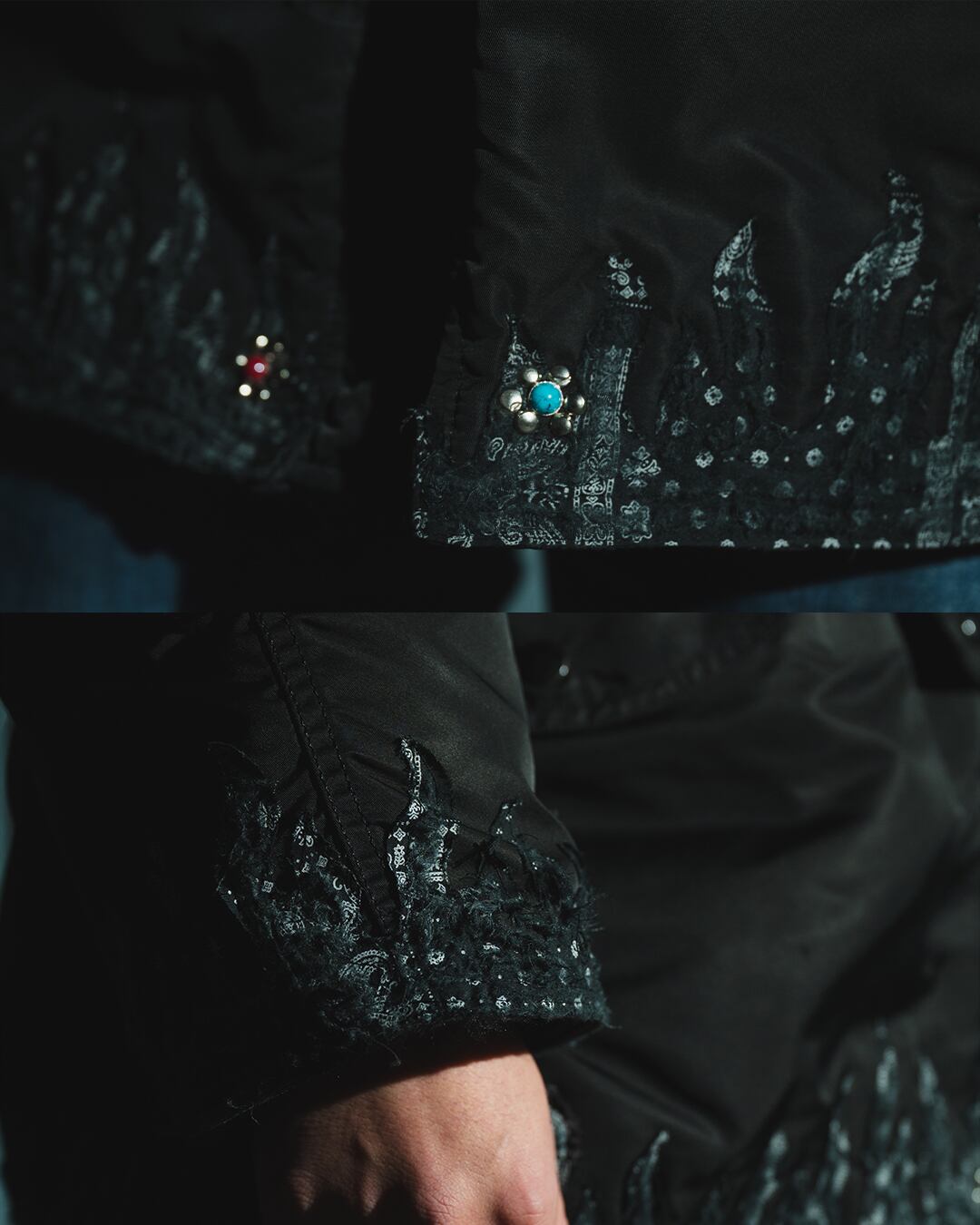 裾と袖にペイズリー調ファイヤーパターンを縫製。