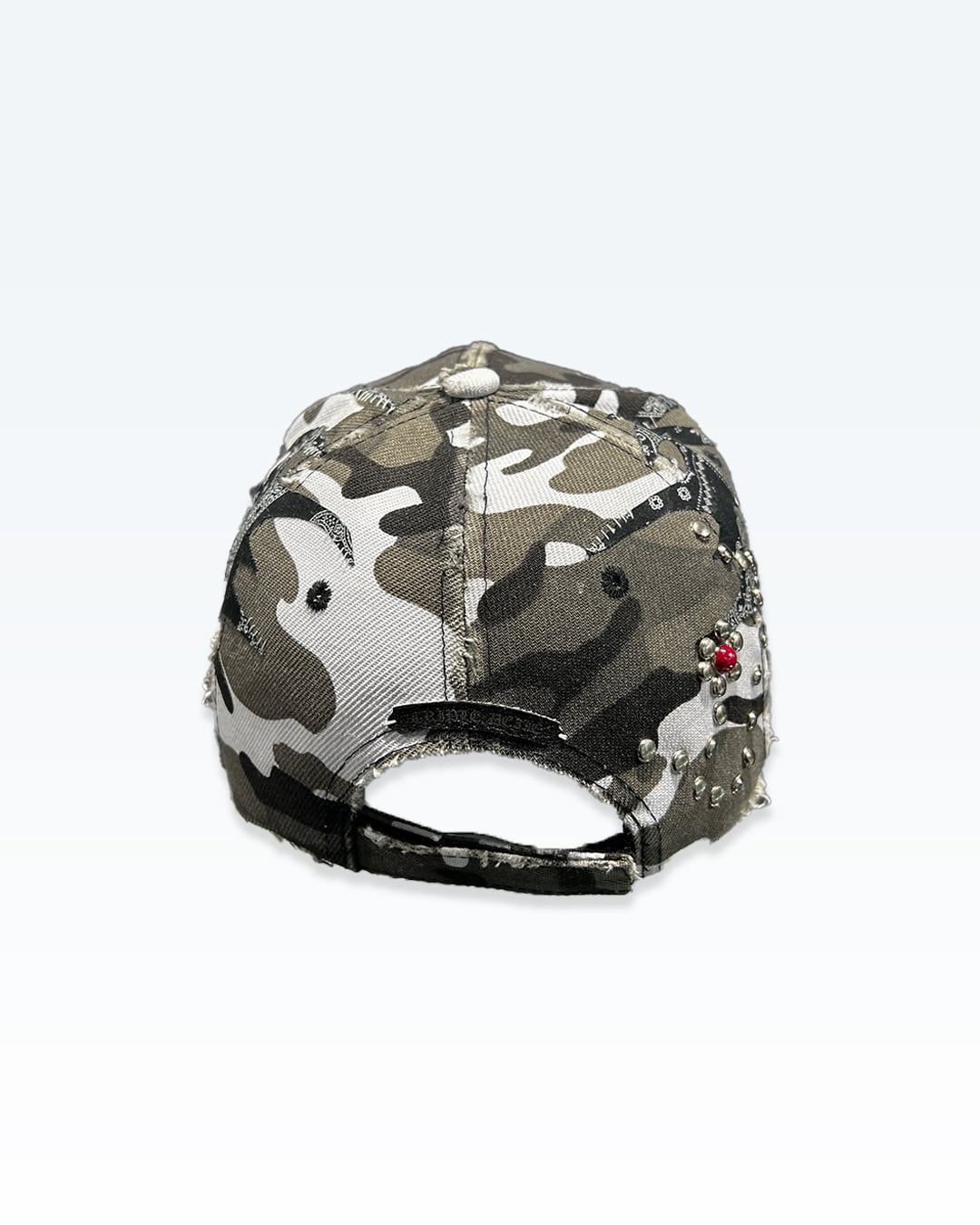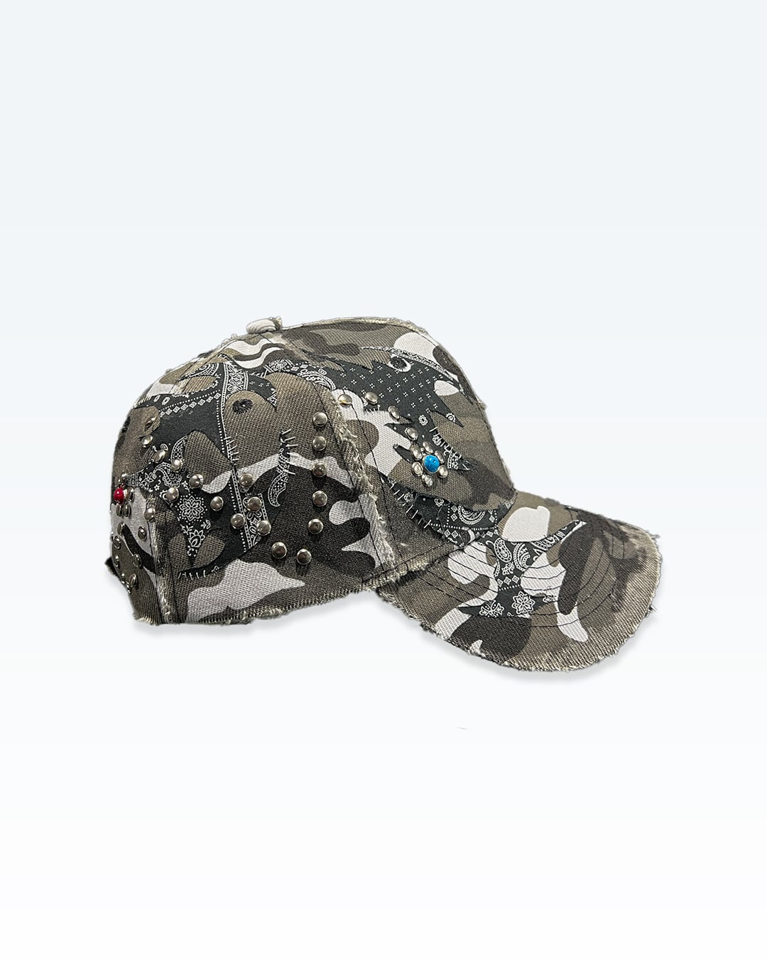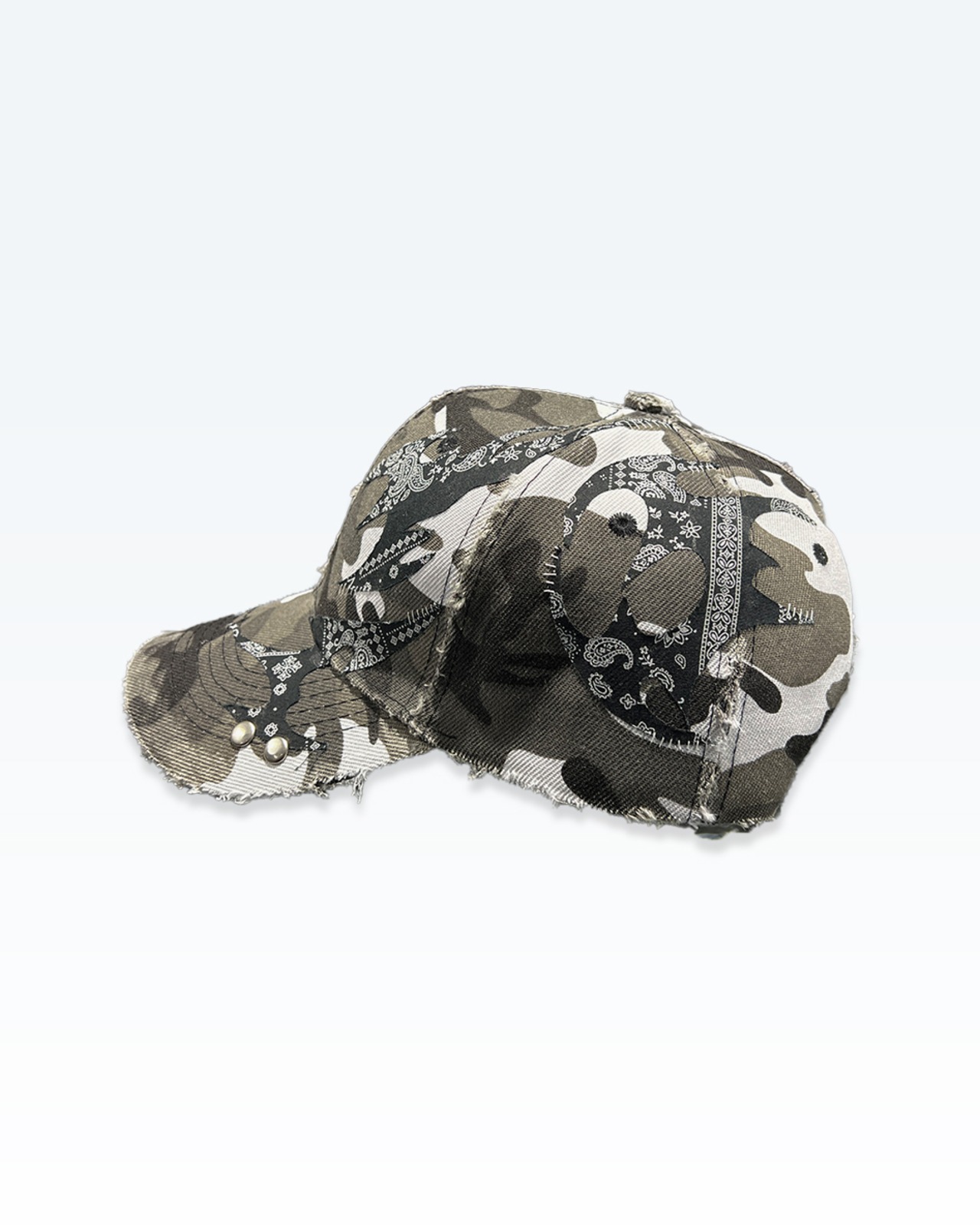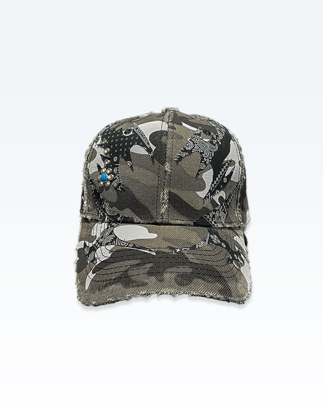 カモフラージュをベースに、ペイズリー由来のトライバルパターンとカシメによるラインワークを重ね、