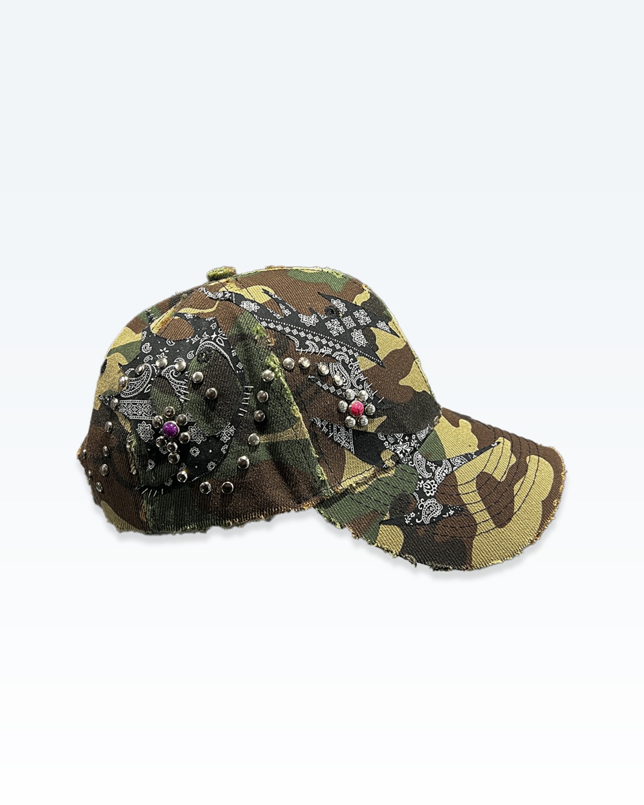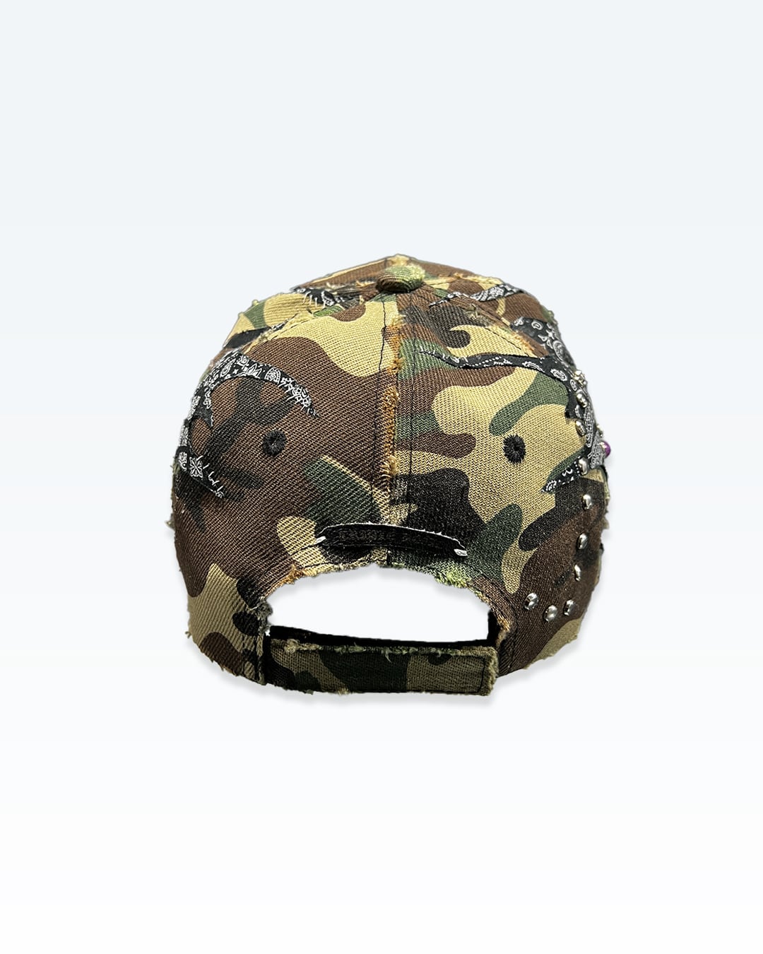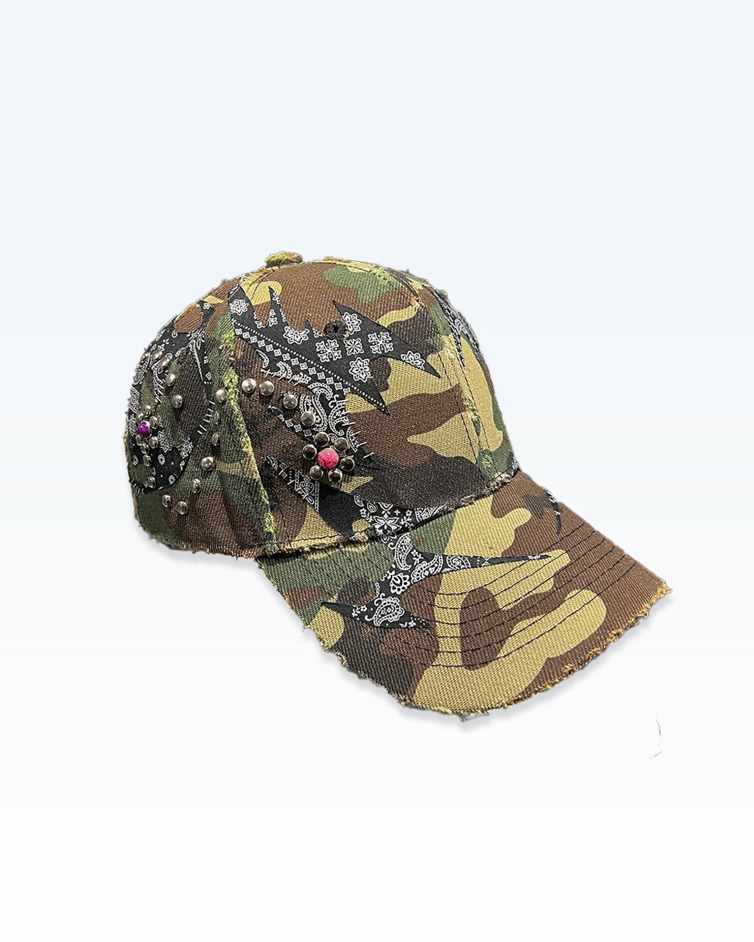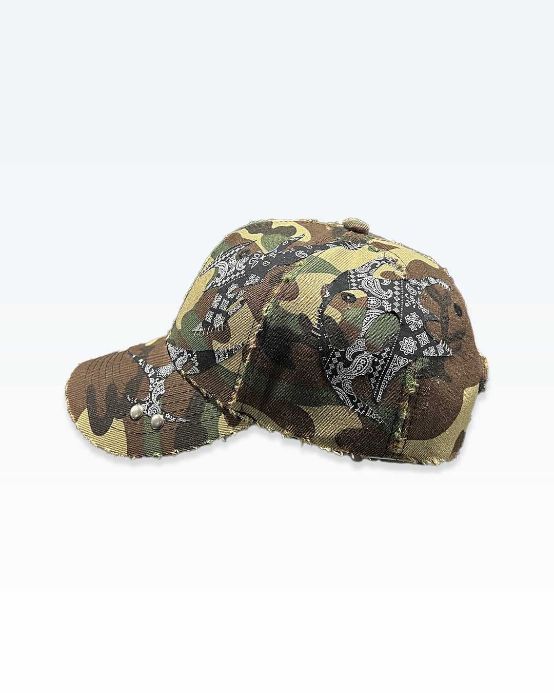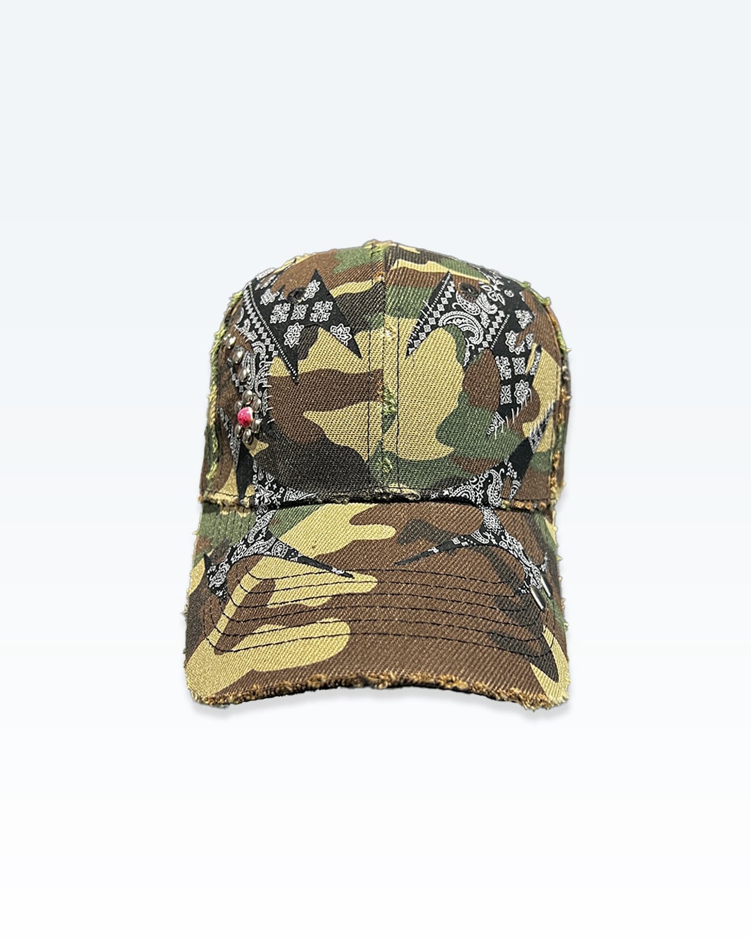 カモフラージュをベースに、ペイズリー由来のトライバルパターンとカシメによるラインワークを重ね、