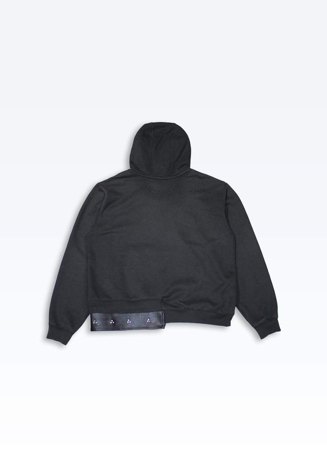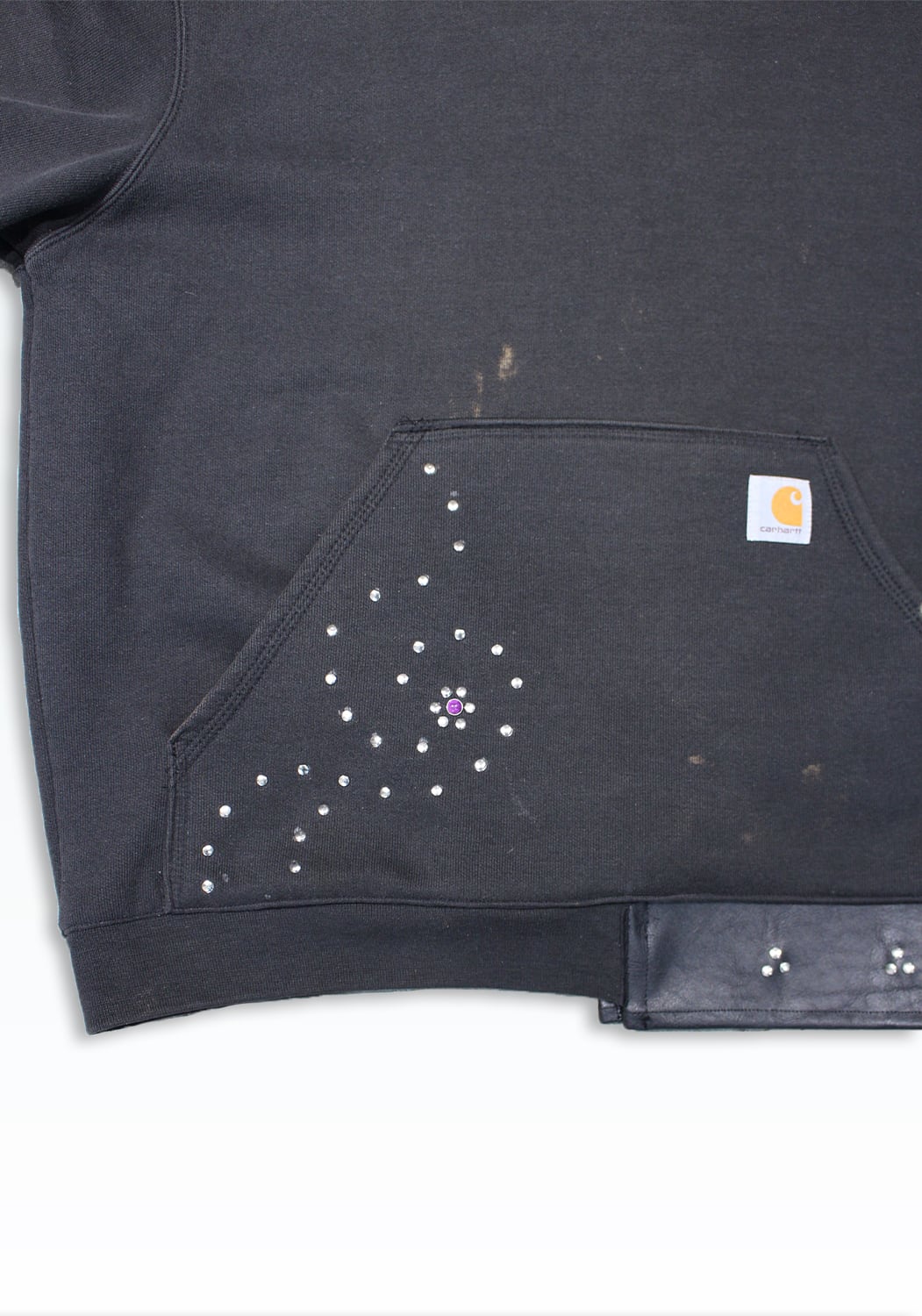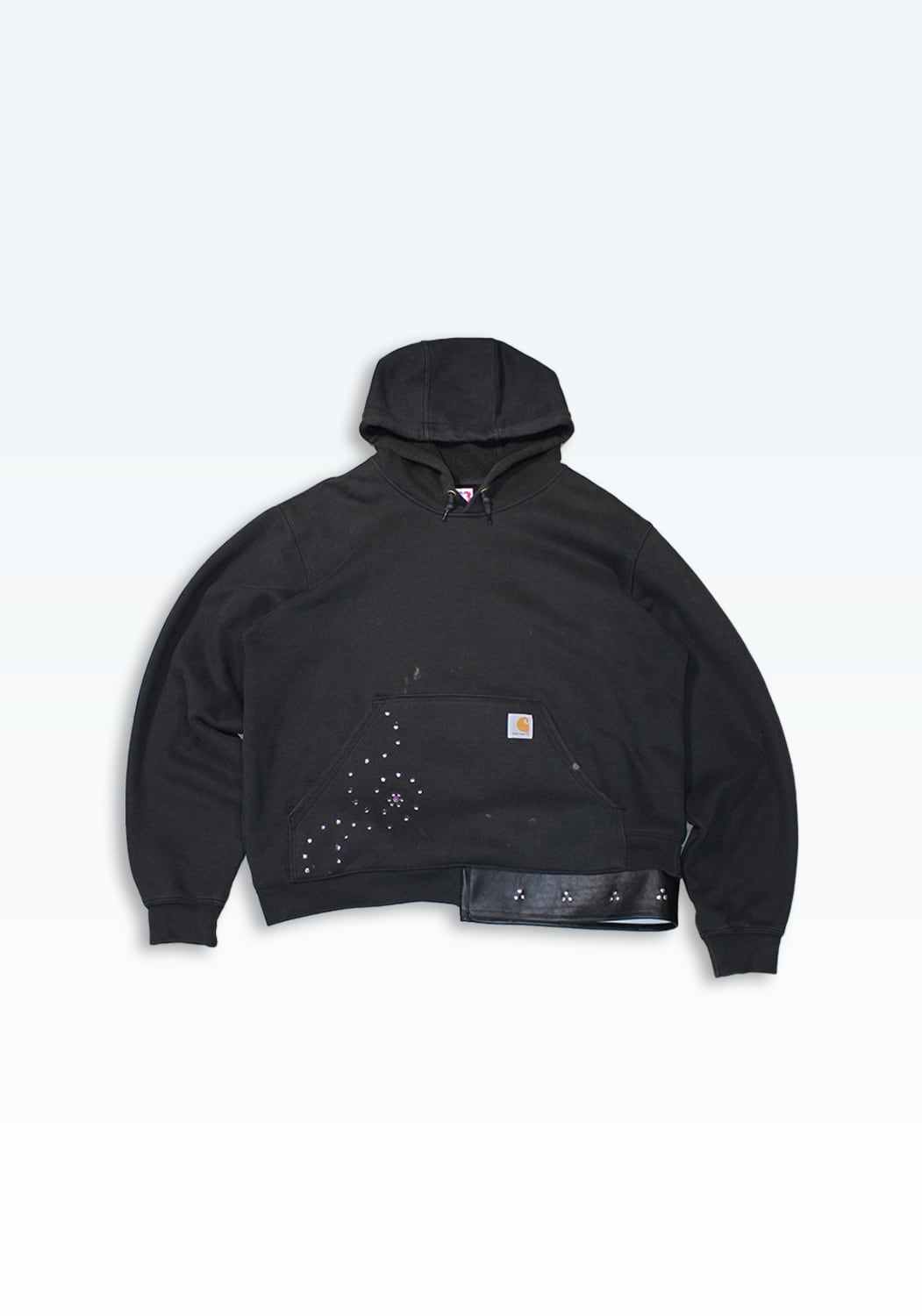 Carharttのフーディーをベースに、裾へレザーを配し、カシメで再構築した一着。