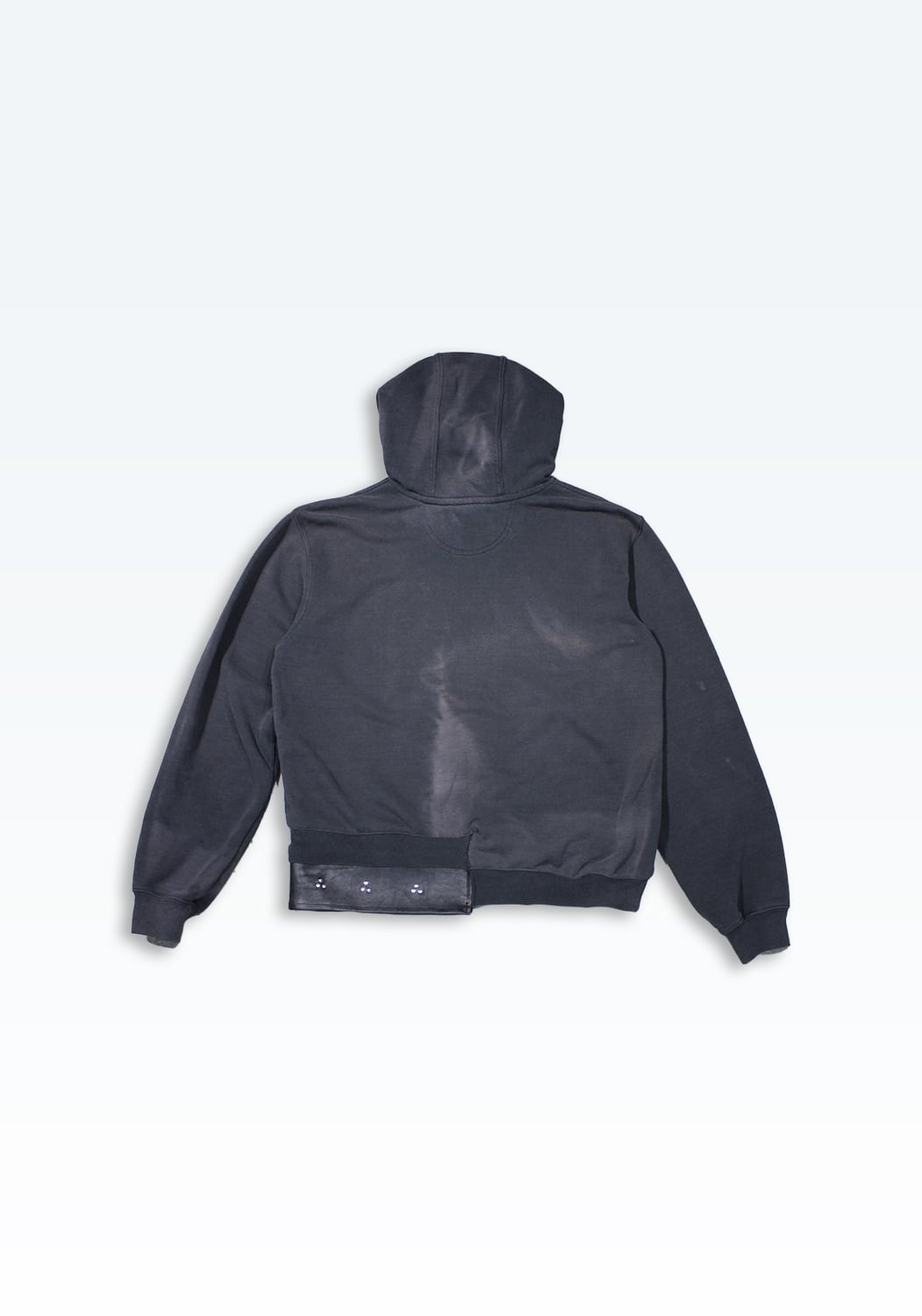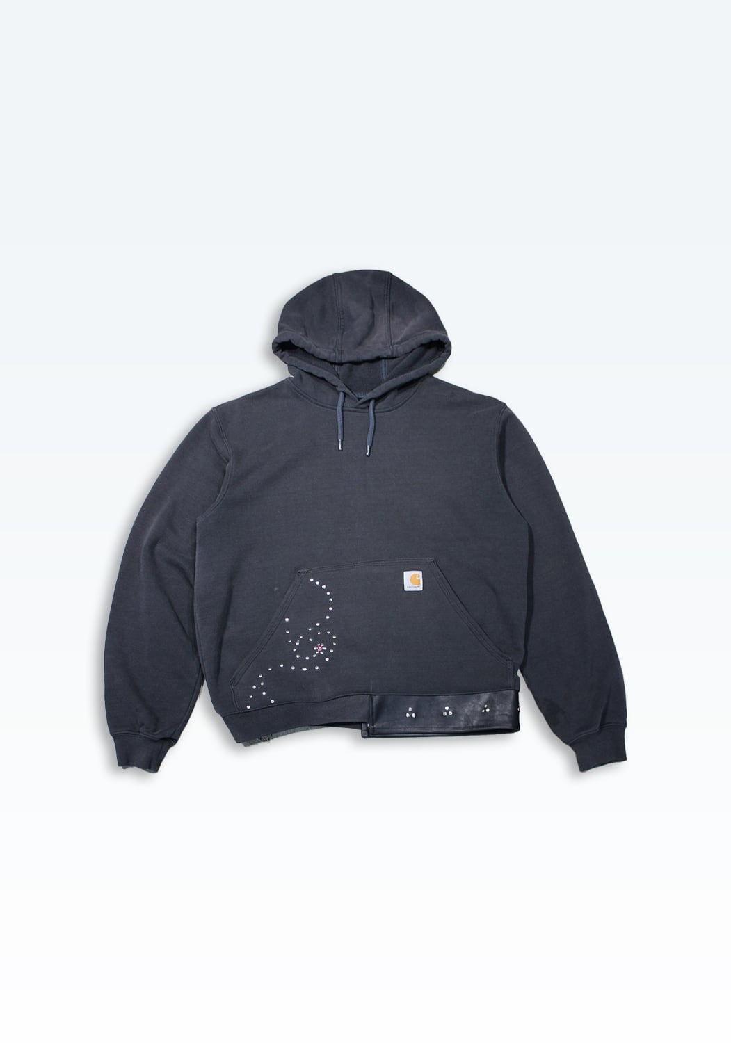 Carharttのフーディーをベースに、裾へレザーを配し、カシメで再構築した一着。