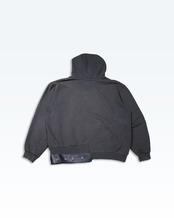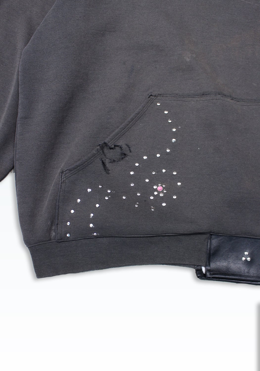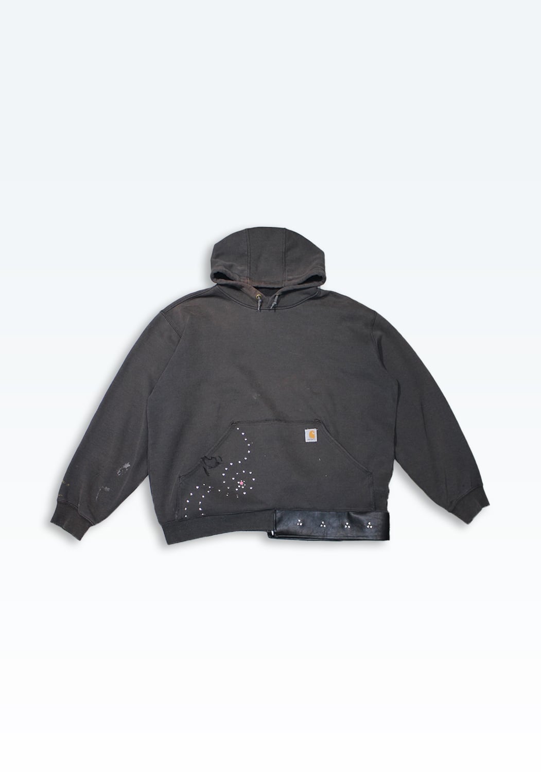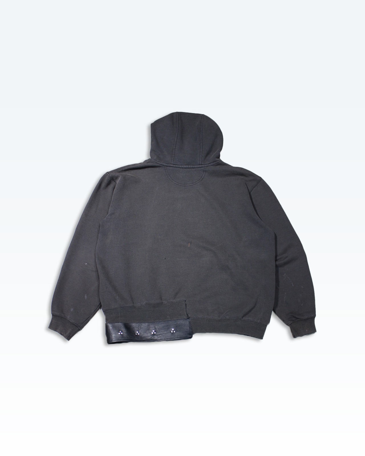 Carharttのフーディーをベースに、裾へレザーを配し、カシメで再構築した一着。