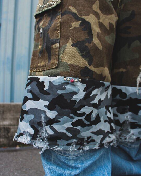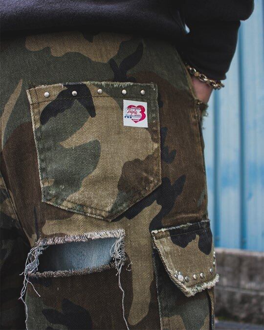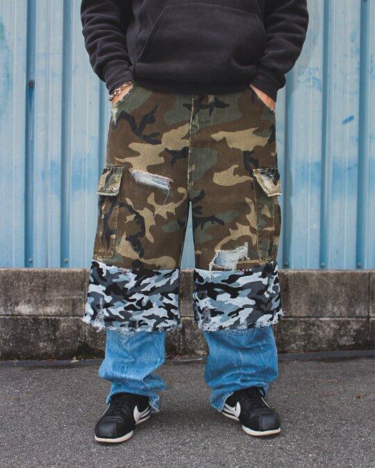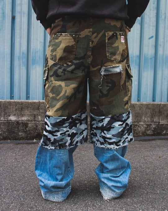異なるミリタリーカモとデニムを解体し、レイヤード構造で再構築したTRIPLE DEMICのリメイクデニム。