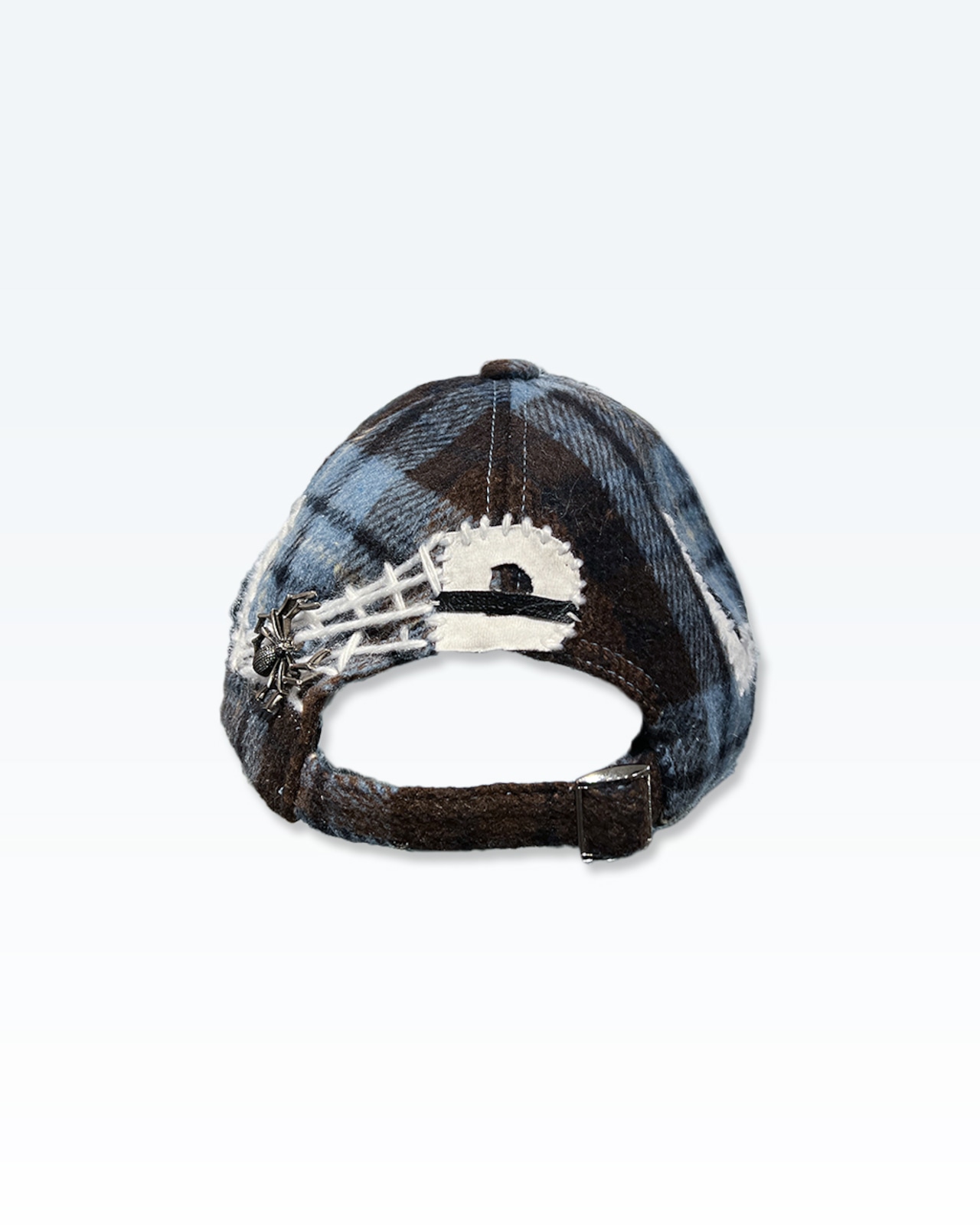 後頭部には蜘蛛モチーフのカシメを打ち込み、毛糸による蜘蛛糸刺子で一点一点表情を加えています。