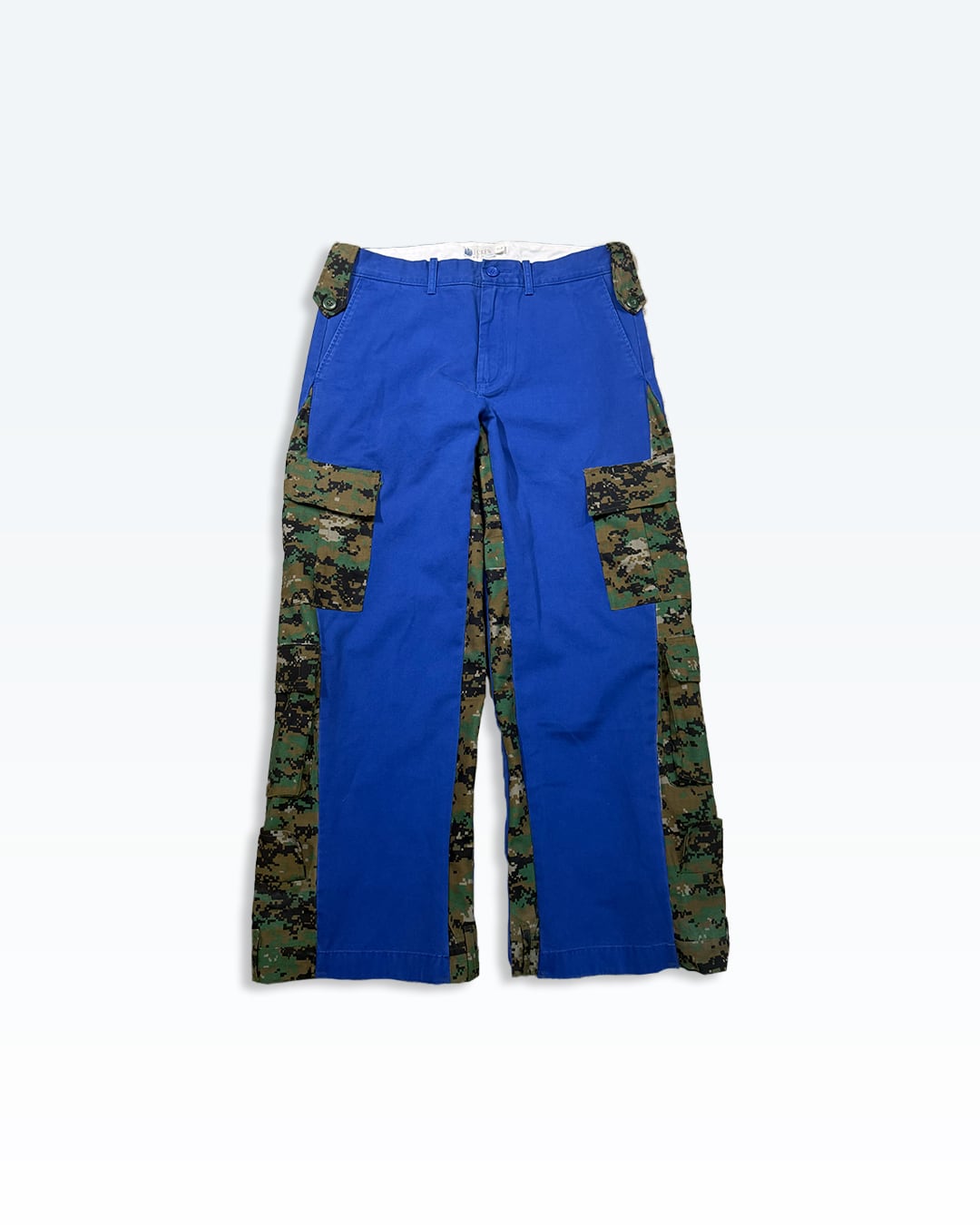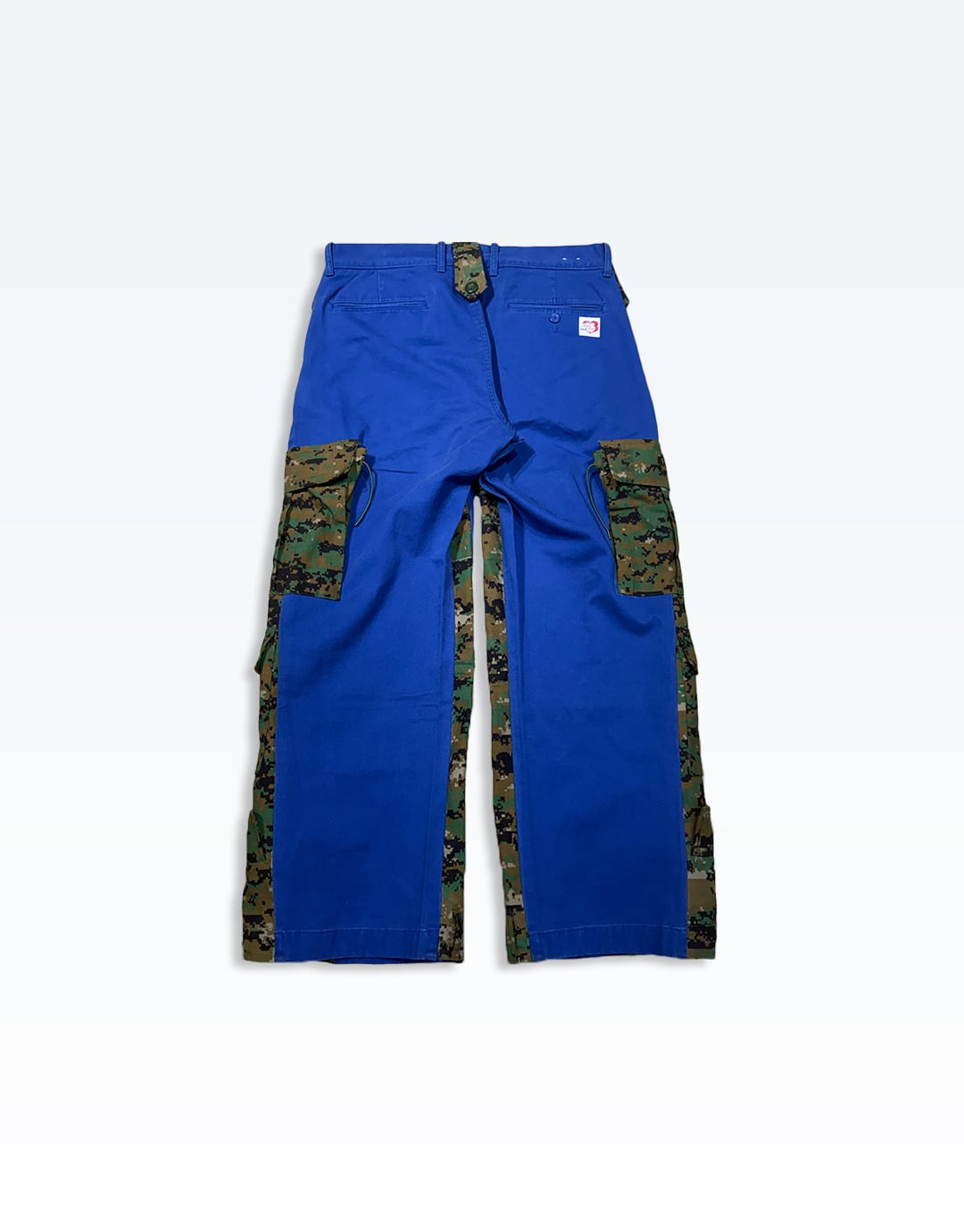 ブルーのワークパンツをベースに、サイドへ迷彩柄ファブリックを拡張し、バギーシルエットへ再構築した一本。