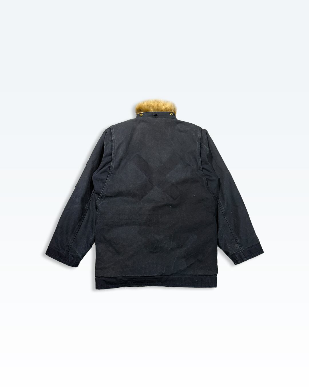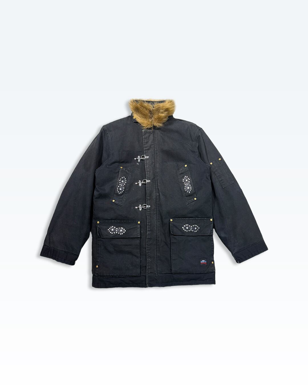 フロントには重厚感のあるトグルフックを配置し、随所にカシメを打ち込むことで無骨さと装飾性を両立。襟元にはファーをあしらい、ワーク由来のアイテムにあえて“品”と“色気”を加えています。