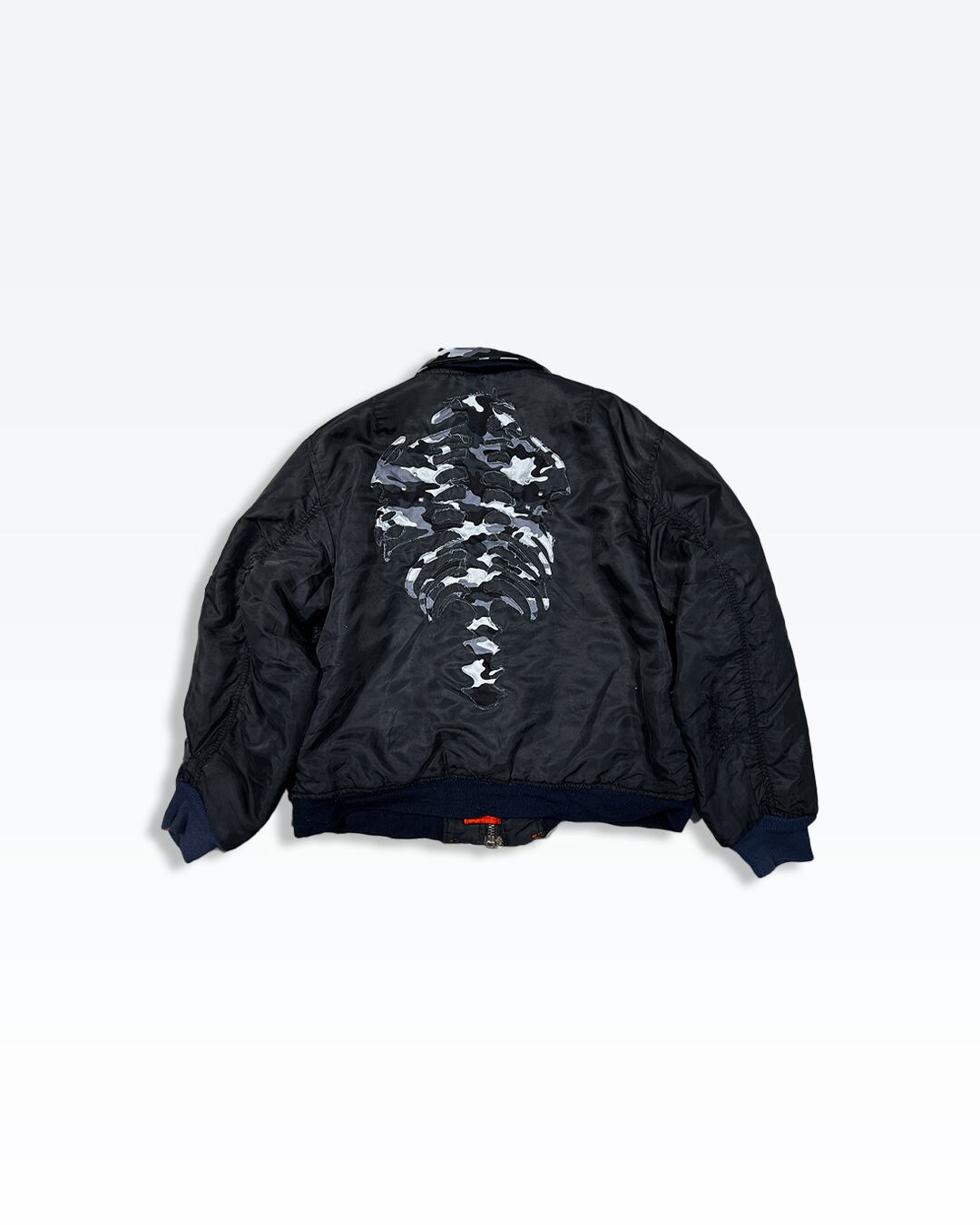 既存のMA-1をベースに、背面へモノトーンのカモフラージュ生地を裁断・再構築し、背骨をモチーフとしたグラフィックとして配置。迷彩という匿名性の高い素材を、あえて“骨格”という個の象徴に落とし込んだ一着です。