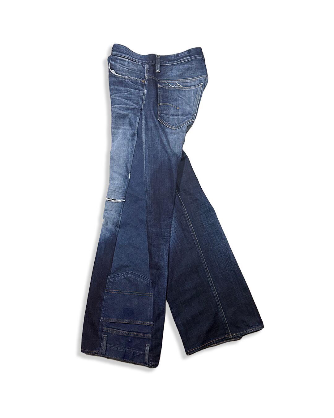 穿き込まれたデニムの質感と、再構築ならではの存在感が特徴の一本です。